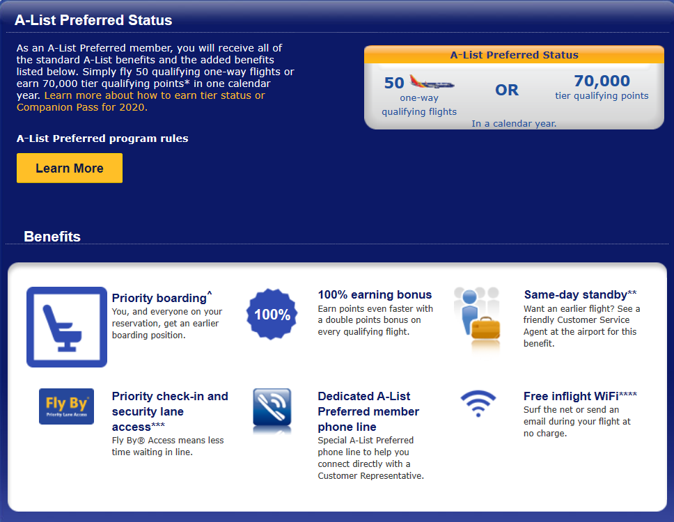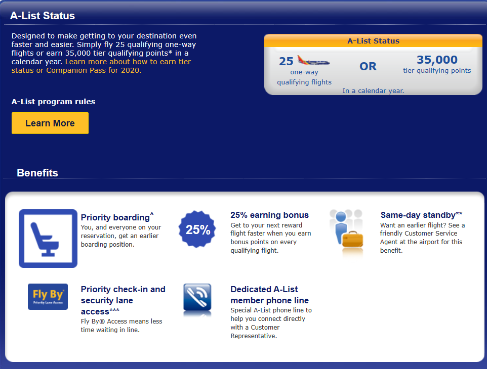 サウスウェスト航空には「A-List」と「A-List Preferred」の2種類ステータスがあります。